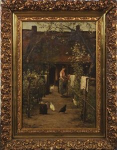 Femme A La Lessive Devant La Ferme, Paysan Sur Un Pont