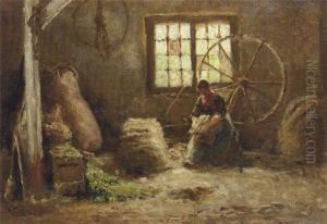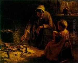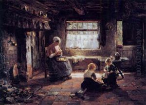 Mother And Child By A Cot In A Cottage Interior