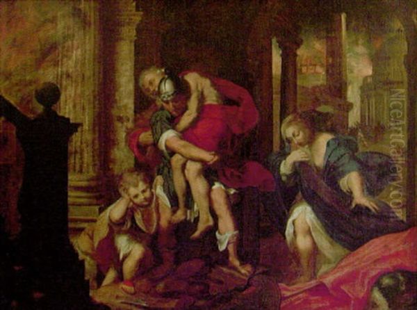 Aeneas, Barande Pa Sin Far Anchises, Flyr Fran Det Brinnande Troja, Tillsammans Med Sin Son Ascanius Och Hustrun Creusa
