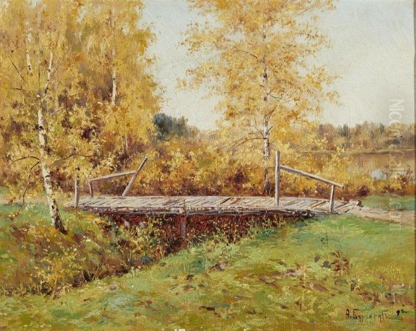 <<Osennij pejzaz s mostom>> Oil Painting by Fedor Karlovich Burkhardt