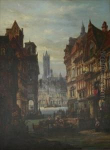 Figures by a bridge, a continental town
