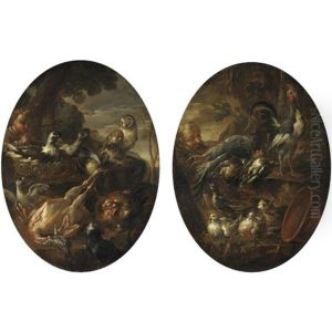 A Hanging Cockerel, Finches, Ducks And Jays With Dead Songbirds And A Grouse On A Table