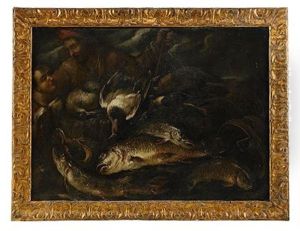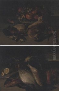 Dead Partridges, A Goose And Other Game, A Cat, Lobsters, Lemons And Mushrooms On A Table, A Basket Of Fish Nearby