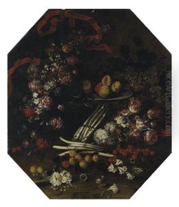 Groses Blumen- Und Fruchtestillleben Vor Einer Sudlandischen Berglandschaft