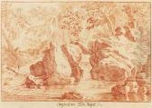 Felsige Flusslandschaft Mit Figurenstaffage Und Burgruine