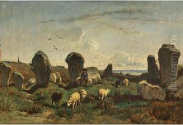 Megalithes En Bretagne [felix Saturnin Brissot De Warville, Megaliths In Brittany, Oil On Panel, Signed.]