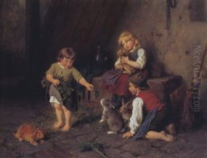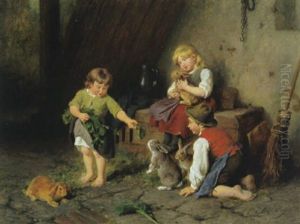 Drei Kinder Mit Hasen Im Stall