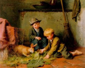 Zwei Knaben Einen Hasen Futternd