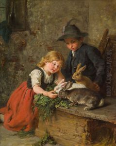 Zwei Madchen Und Ein Bub Mit Hasen