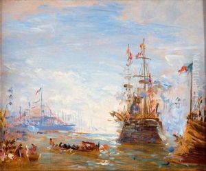 Voilier Et Regates Sur Le Bosphore Huile Sur Panneau, Signee En Bas A Droite
