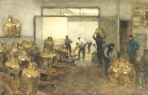 Dutch Workers With Windmills Beyond