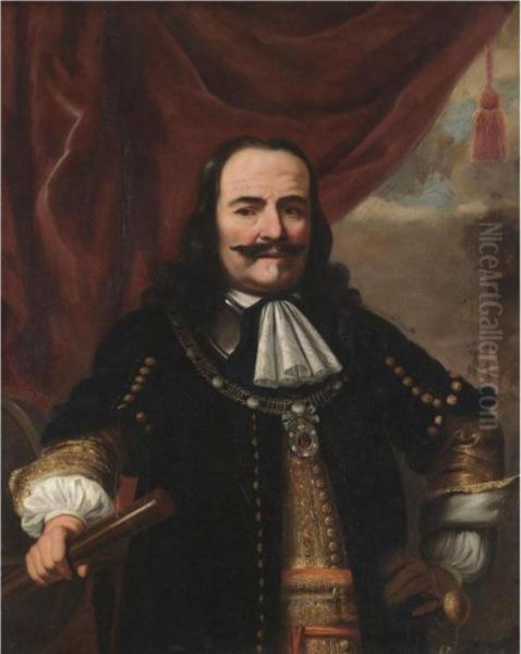 Portrait Of Admiral Michiel Adriaensz De Ruyter, Half-length,wearing A Black Coat And Holding A Telescope, With An Openedcurtain Behind