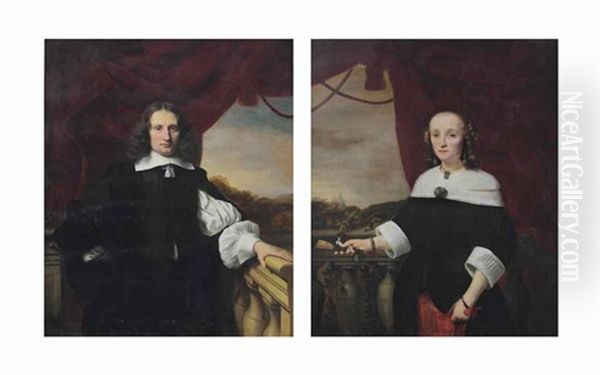 Portrait Of Pieter Bouwens (1621-1680), Three-quarter Length, In A White Chemise And Black Costume Standing Before A Curtain On A Balcony; And Portrait Of His Wife Anna Maria Van Nutt (1622-1686), Three-quarter Length, In A Red Embroidered And Black Dress
