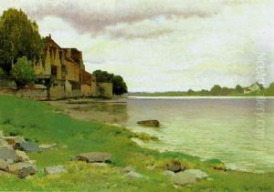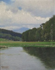 Nordliche Flusslandschaft Mit Windmuhle Im Sonnigen Licht An Einem Sommertag