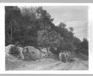 Haus unter Baumen und zwei Kinder (Ahorn bei Ischl)