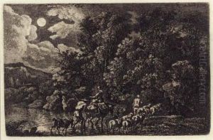 Nachtliche Flusslandschaft Mit Einer Steineren Bogenbrucke, Einem Turm Und Figuren Bei Einem Feuer