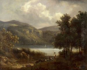 Flusslandschaft mit Wasserfall, rastendem Wanderer, Hirten mit Kuhen und Ziege sowie drei Reisenden