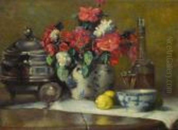 Stillleben Mit Blumen, Flasche, Glas, Schale, Zitronen Und Deckelgefass