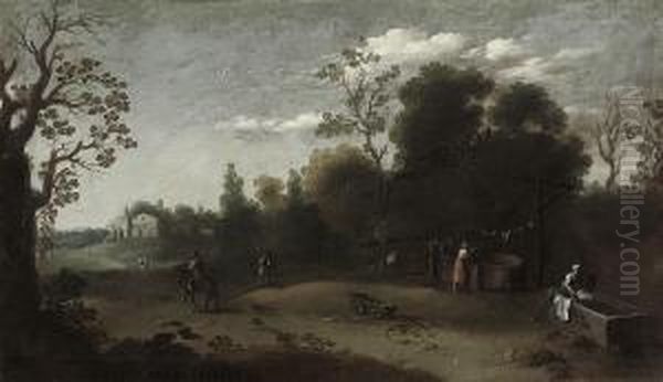 A Wooded Italianate Landscape With Washerwomen In The Foreground