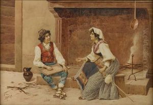 A Young Italian Woman Lighting A Lamp At A Wayside Shrine Watched By A Young Male Musician.
