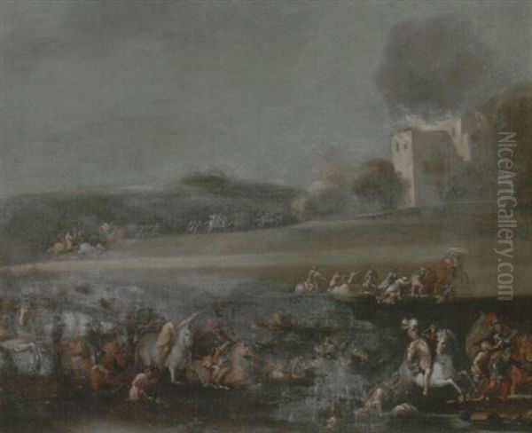 A Troop Of Cavalry Fording A River, A Besieged Town Beyond