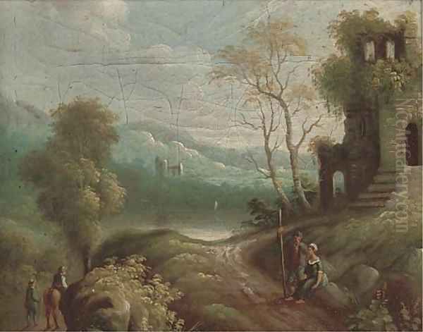 A river landscape with peasants on a path