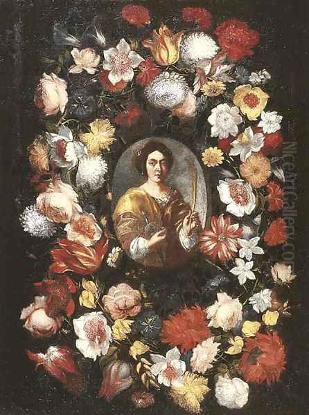 Roses, tulips, narcissi, carnations and other flowers in a garland surrounding a medallion of a female Saint