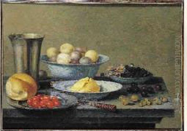 Nature Morte Aux Prunes Et Raisins Dans Des Porcelaines Wang-li Et Pieces D'orfevrerie Sur Un Entablement