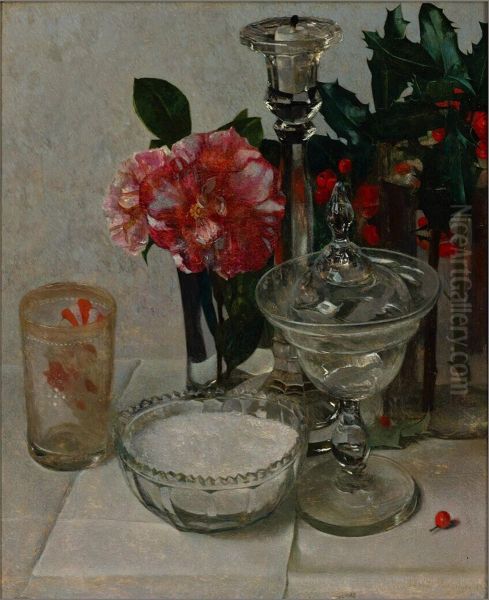 Stilleven met camelia's en kristallen schaaltje