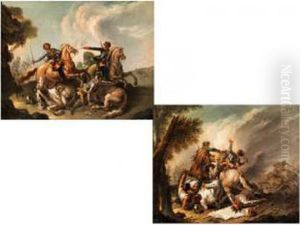 A Soldier In Armour, On A Rearing Horse In A Landscape, A Skirmish Beyond