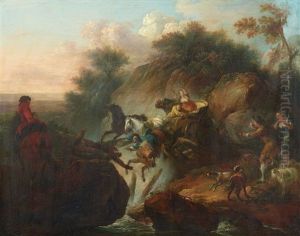 A Herder And Travelers On A Mountain Pass Near A Stream