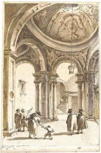 Figures in a loggia below an elaborately stuccoed cupola, a courtyard beyond
