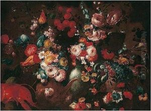 Still Life Of Flowers In A Vase Resting On A Stone Ledge With A Plate Of Cherries