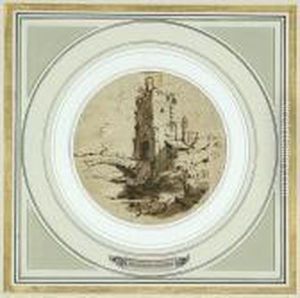 A Capriccio View Of A Ruined Temple Near A Bridge, Figures On The River Bank In The Foreground