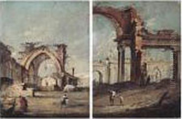 An Architectural Capriccio With Two Figures Before Classical Ruins