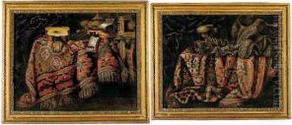 Still Lifes Of Armour, Musical Instruments And Other Objects On Tables Draped With Carpets