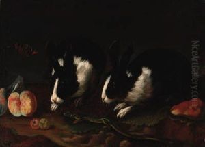 Rabbits, A Lizard, Pears, Peaches And A Red Admiral Butterfly