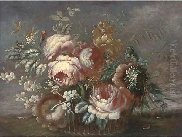 Roses, chrysanthemums and other flowers in a basket, a landscape beyond