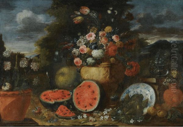 Still Life With A Large Arrangement Of Flowers In A Carved Stone Urn, With Open Watermelons, Figs And Earthenware Pots On The Garden Floor Beneath