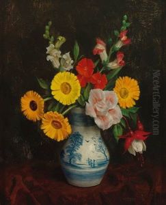 Blumenstilleben In Einer Reliefierten Vase Mit Putto Und Lowe Vor Dunklem Hintergrund