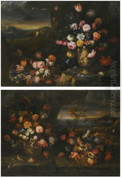 Still Life With Vase Of Flowers In A Coastal Landscape Setting (+ Another; Pair)