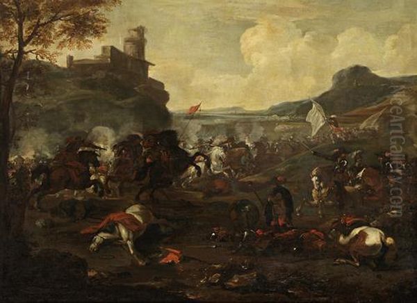 A Cavalry Skirmish Beneath A Castle On Anoutcrop With A Plain Beyond