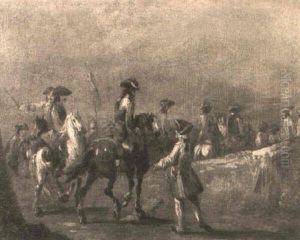 A Cavalier Wearing A Red Sash With His Groom, Another Horseman Beyond (+ A Cavalier In A White Satin Coat With A Pink Waistcoat And His Groom, A Horseman Beyond; Pair)