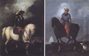 A Cavalier Wearing A Red Sash With His Groom, Another Horseman Beyond (+ A Cavalier In A White Satin Coat With A Pink Waistcoat And His Groom, A Horseman Beyond; Pair)