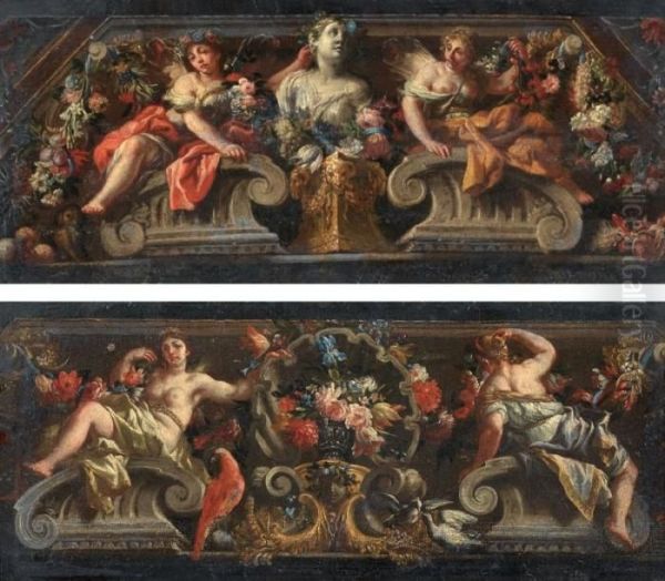 Due Virtu Alate Con Busto Di Flora Su Piedistallo E Due