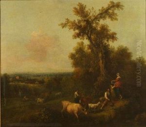 An Italianate Landscape With Figures Beneath A Crucifix, A Church Beyond; A Pastoral Landscape With Peasants And A Fisherman Near A Pond, A Shepherd With His Flock Beyond
