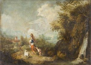 Pastoral River Landscape With A Shepherd And A Dairymaid Beside A Small Cascade