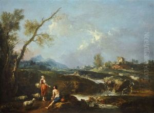 An Italianate River Landscape With A Herdsman And Women Fetching Water