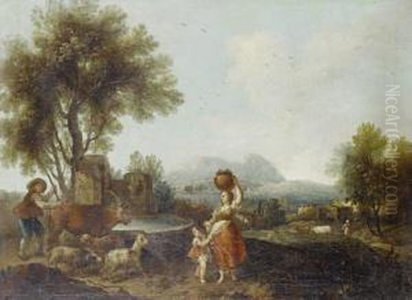 A Pastoral Landscape With A Washerwoman Andher Child Beside A Well, A Cowherd With His Livestock And A Countryvillage And Mountains Beyond