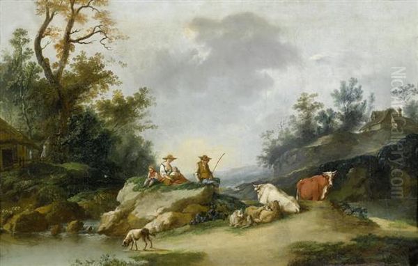 A Shepherd Couplewith Animals In A Mediterranean Landscape